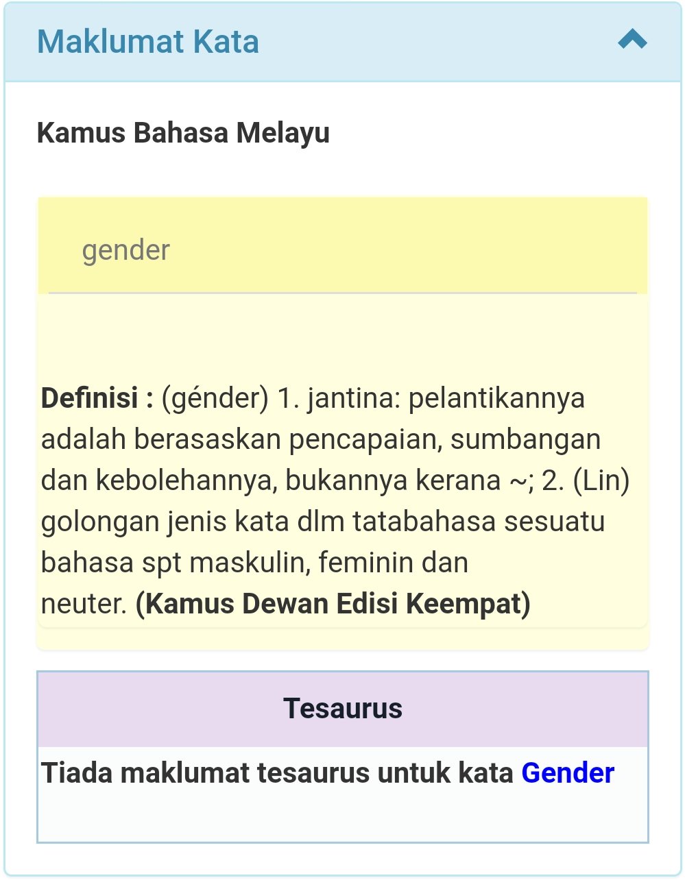 Pastikan perkataan Bahasa Melayu itu sah dan diterbitkan oleh DBP iaitu Kamus Dewan Pusaka dan Bahasa. Menurut Lakoff bahasa perempuan mempengaruhi pendeskripsian karakterisitik perempuan. Nathesan 1998 dalam kajiannya yang bertajuk Leksis Gender dalam Bahasa Melayu.